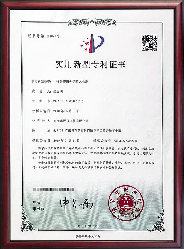 • 专利证书-低烟无卤高阻燃新型环保电缆
