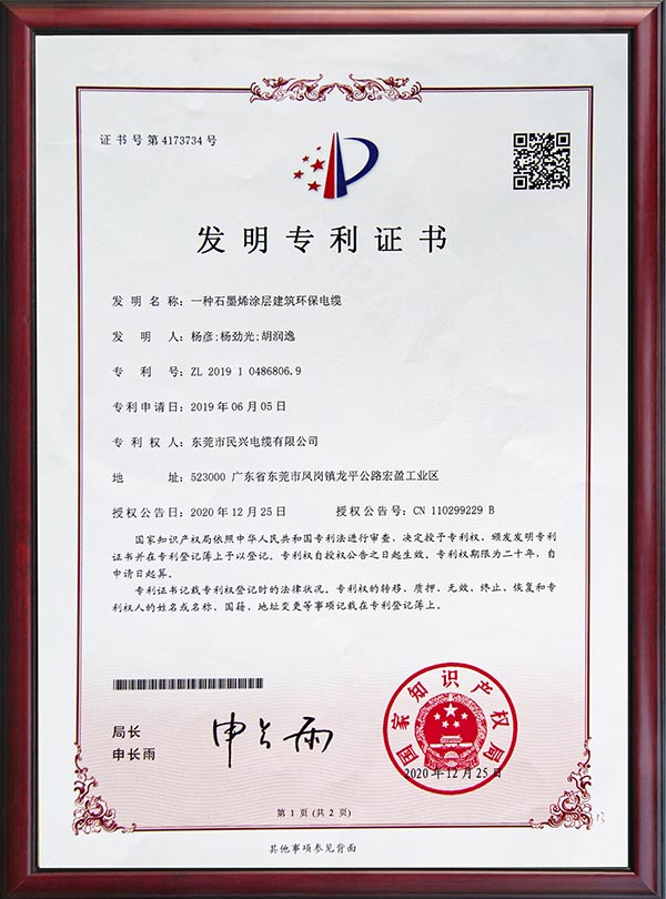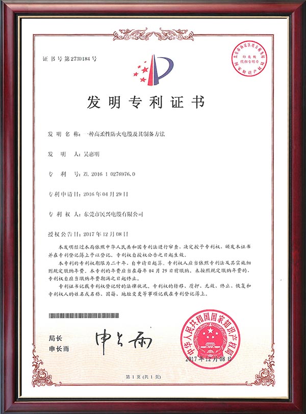 • 发明专利证书-一种高柔性防火电缆及其制备要领