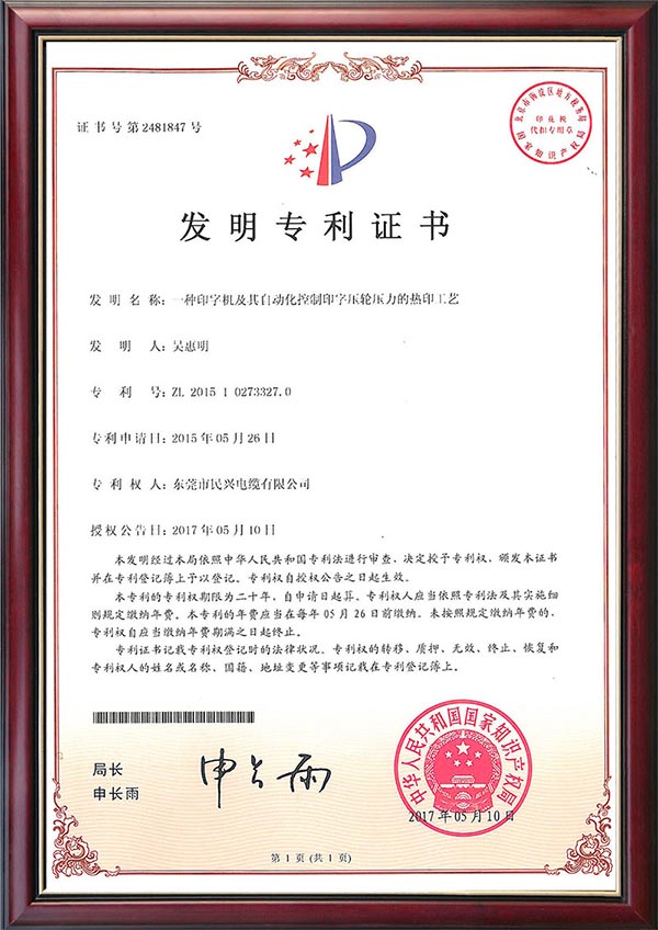 • 发明专利证书--一种接纳热印和电子喷码团结的电缆加工工艺
