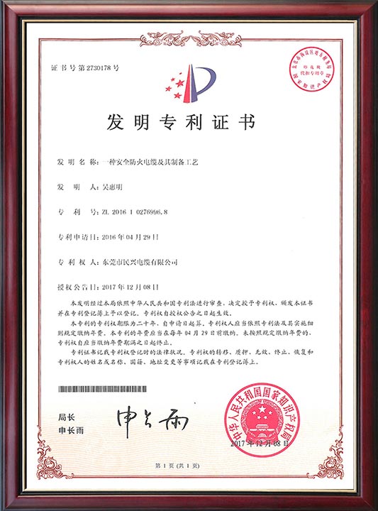 • 发明专利证书-一种清静防火电缆及其制备工艺